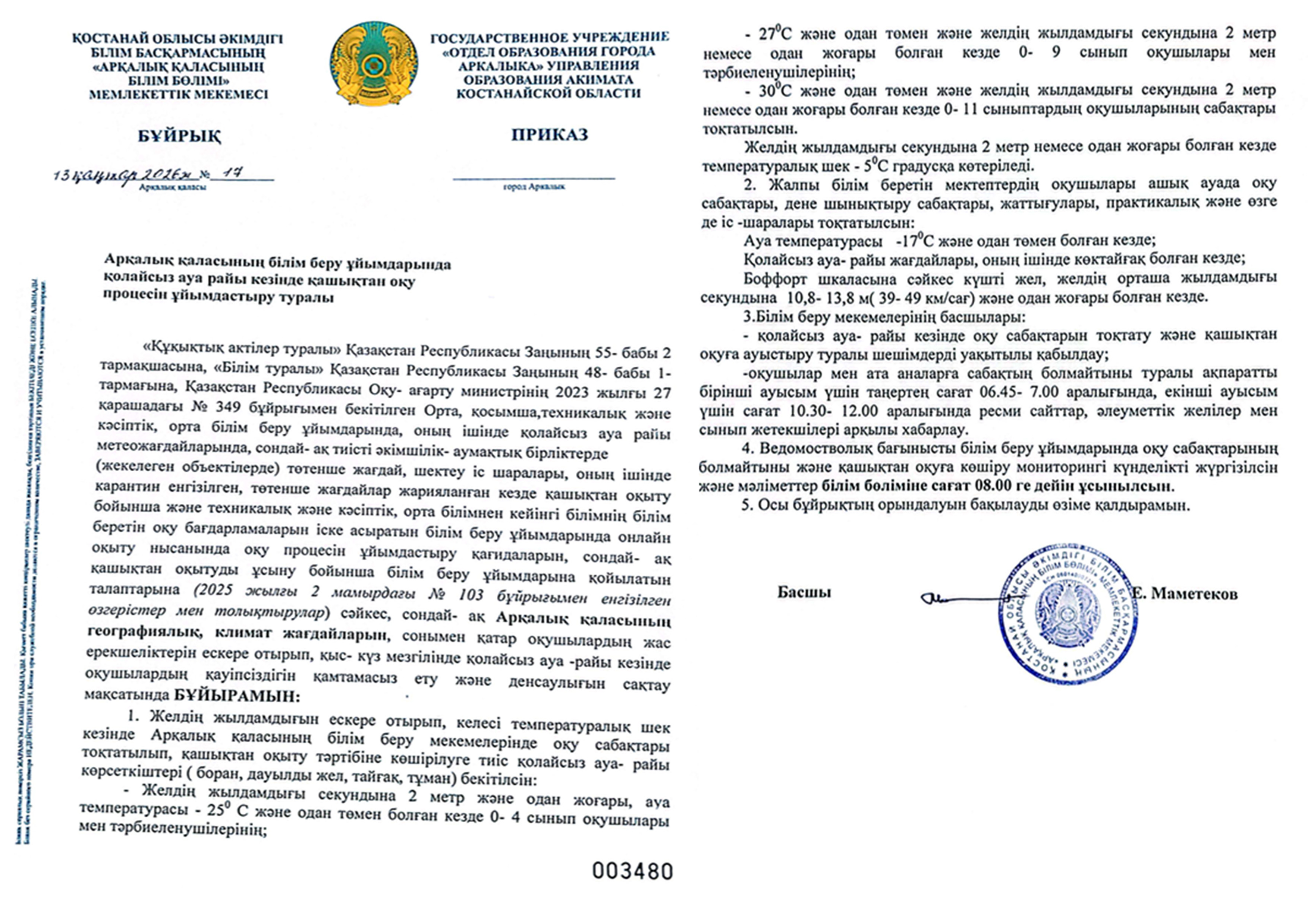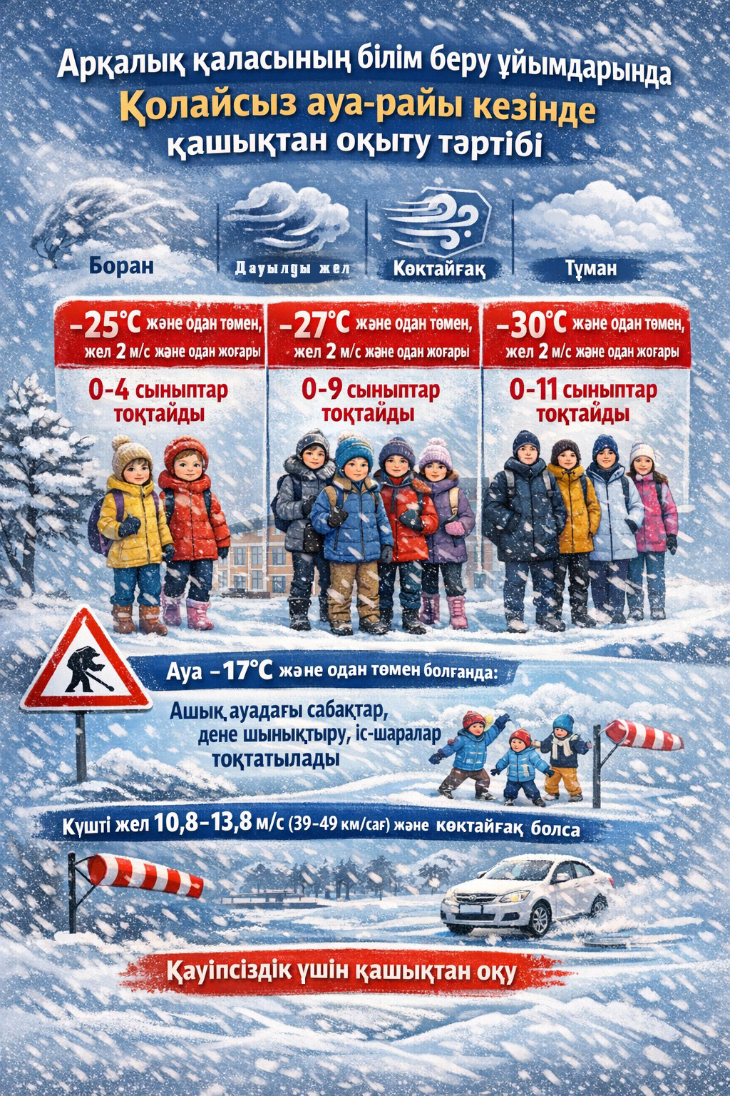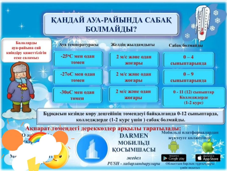 Егер желдің күші секундына 2 метрден асса, -23 градуста 1-4 сынып оқушыларына, -27 градуста 5-9 сынып оқушыларына, -29 градуста 10-11 сынып оқушыларына және колледждің 1-2 курс студенттеріне оқу шегеріледі.