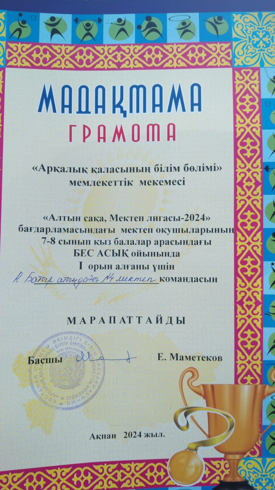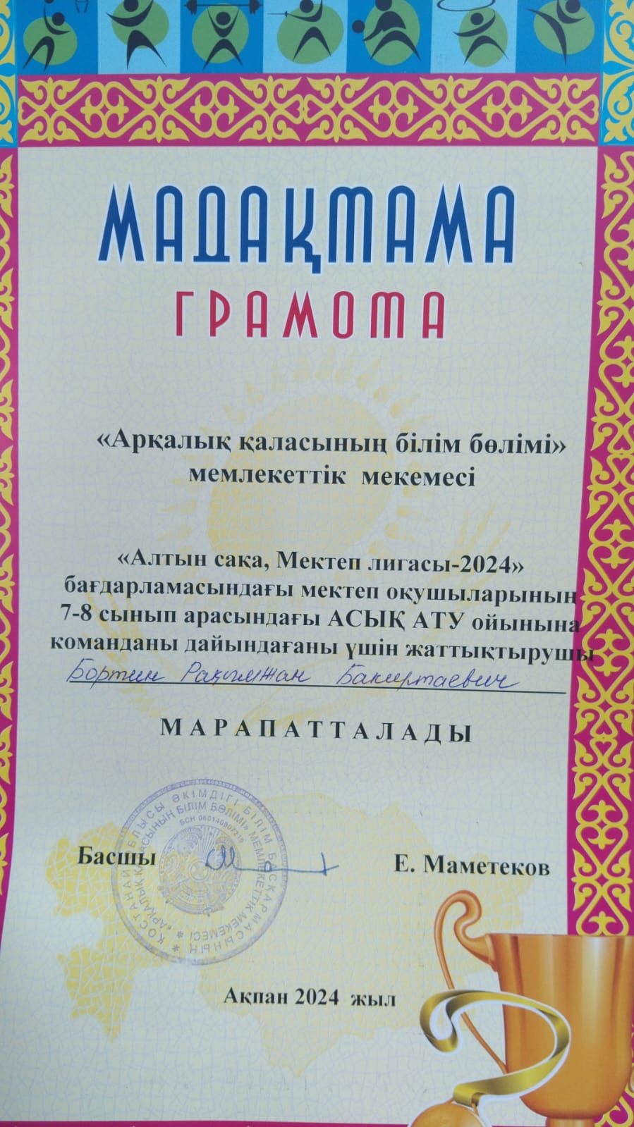 Сәкен Сейфуллиннің 130 жылдық мерейтойына орай ұйымдастырылған «Тоғызқұмалақтан» 5-6 сыныптың оқушылары арасындағы «Мектеп дигасы - 2024» жарысында мектебіміздің оқушылары ІІІ орын иеленді.