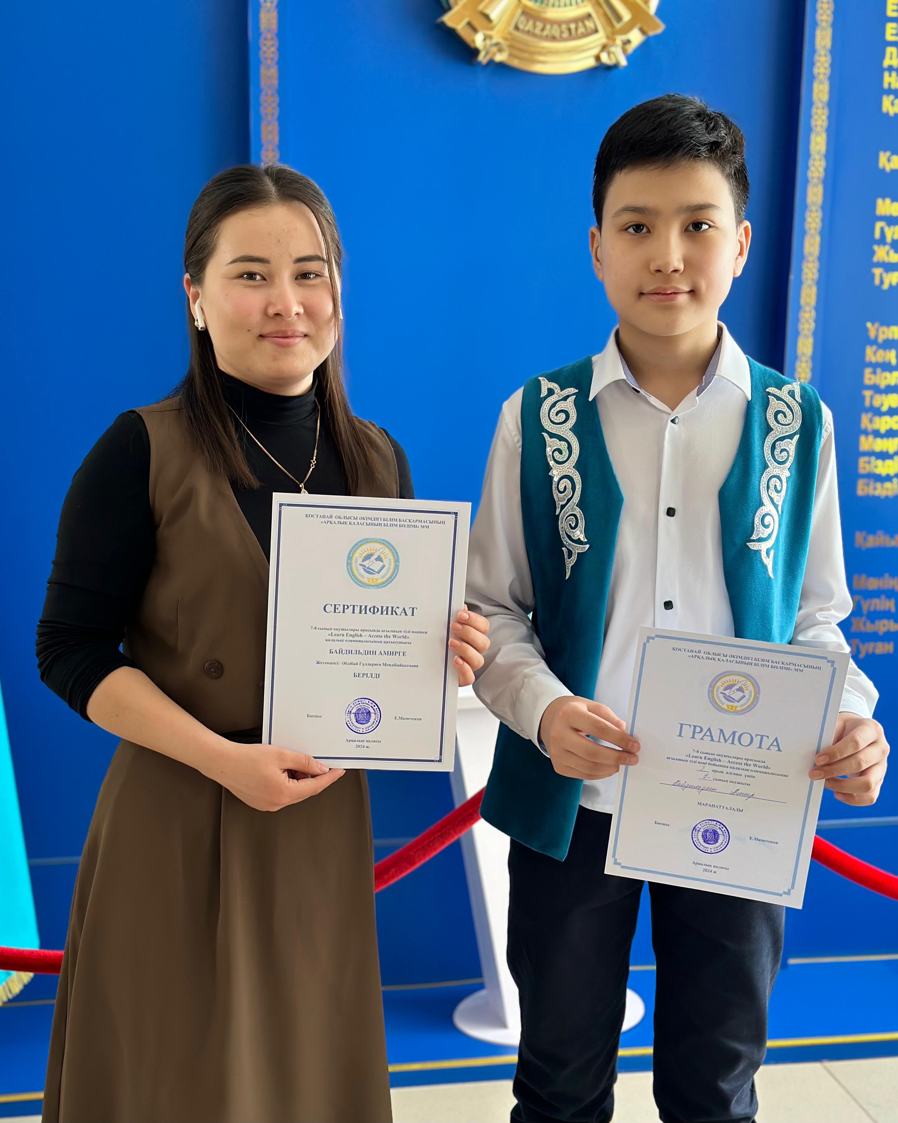 7-8 сынып оқушылары арасында ағылшын тілі пәнінен "Learn English -Access the World" қалалық олимпиадасының І орын иегерлері Байдильдин Амир 7 "А" сынып оқушысы мен Қайрат Ажар 8 "Б" сынып оқушысы