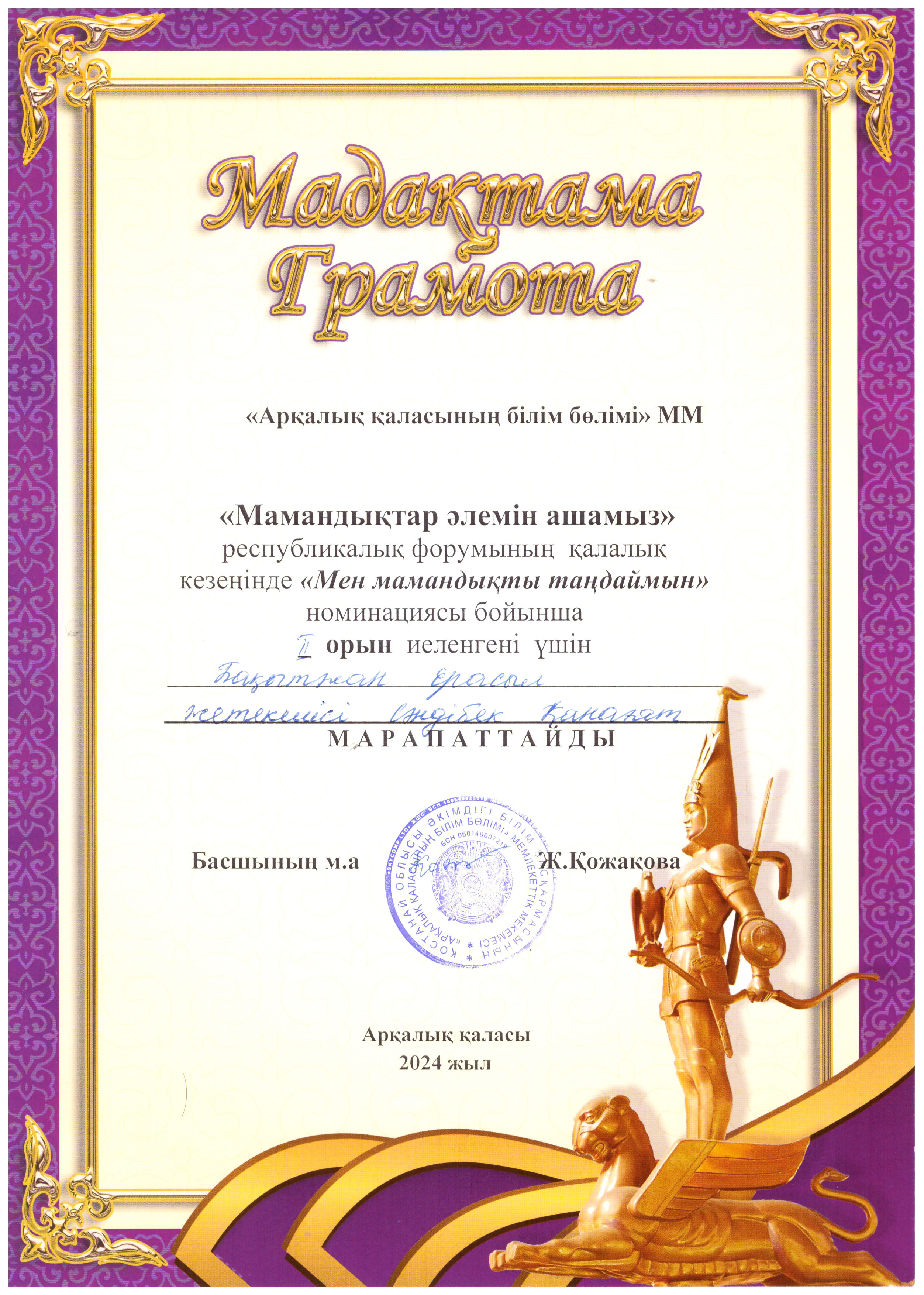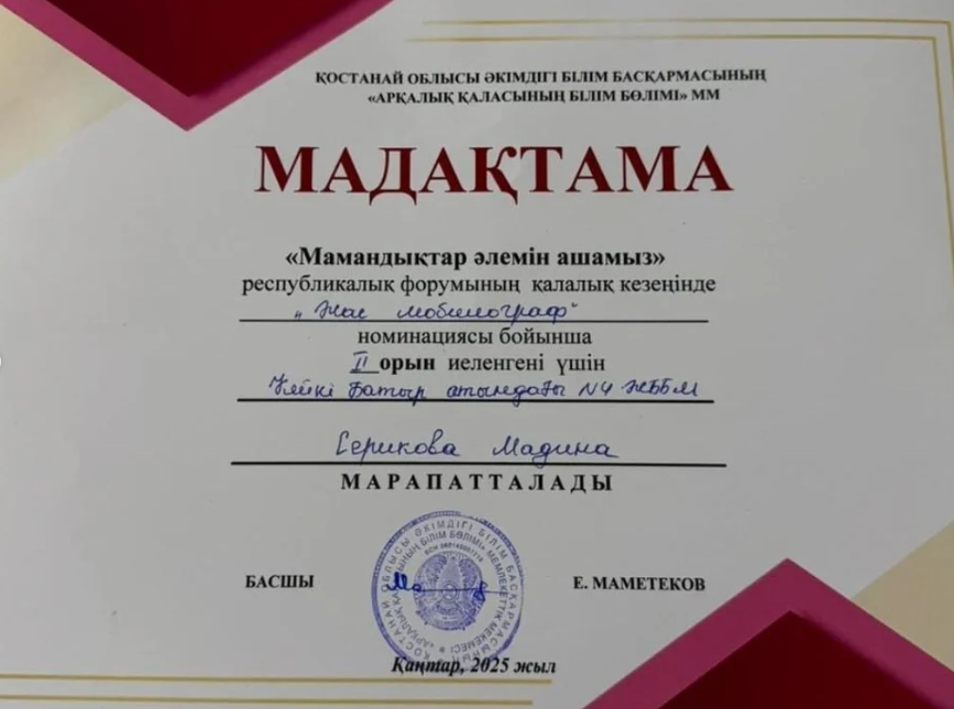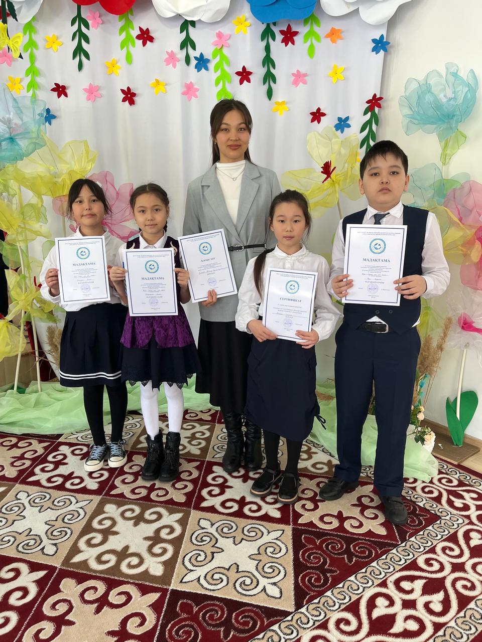 4-сынып оқушыларына арналған ағылшын тілі пәні бойынша ұйымдастырылған қалалық олимпиадаға оқушыларымыз қатысып, жүлделі орындар иеленді. Пән мұғалімі Хужаева Айбану Бақытбергенқызы қалалық білім бөлімінің алғыс хатын алды.