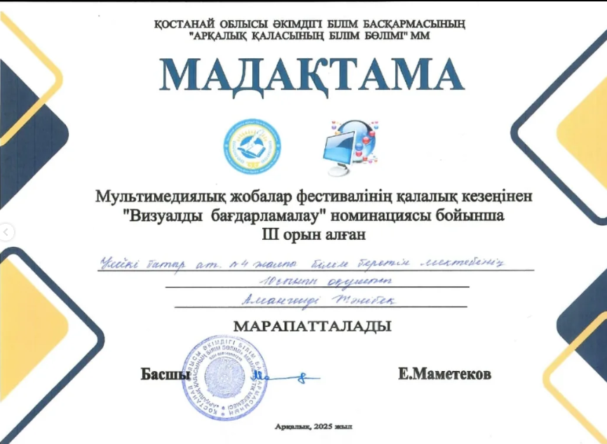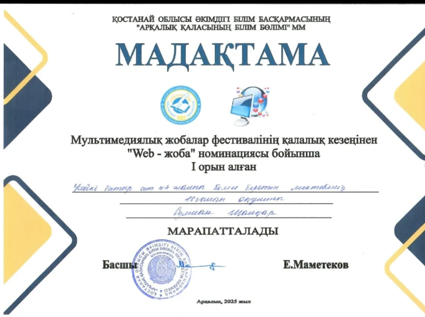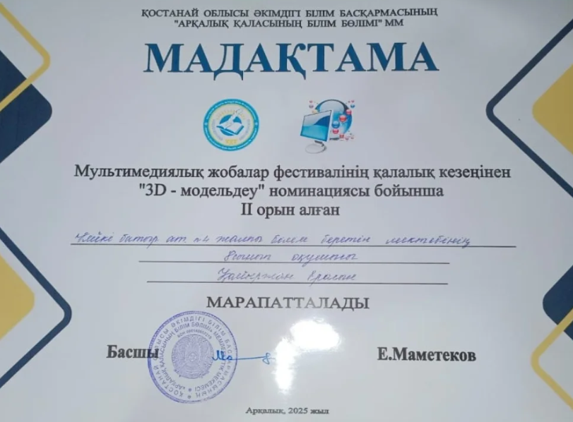 "Арқалық қаласының білім бөлімінің" жоспарына сәйкес "Мультимедиялық жобалар фестивалінің" қалалық кезеңі өтті.Сайысқа мектеп оқушылары өздерінің жұмыстарымен қатанасып, төмендегідей нәтижелер көрсетті."Визуалды бағдарламалау" номинациясы бойынша Амангелді Жәнібек 3 орын. Жетекшісі: Альмагамбетов Руслан Каирбекович."3D модельдеу" номинациясы бойынша Қайыржан Ерасыл 2 орын. Жетекшісі: Карашинов Каскырбай Серикбаевич. "Web бағдарламалау" номинациясы бойынша Сулман Шалқар 1 орын алды. Жетекшісі: Жүніс Бек - Әбіл.
