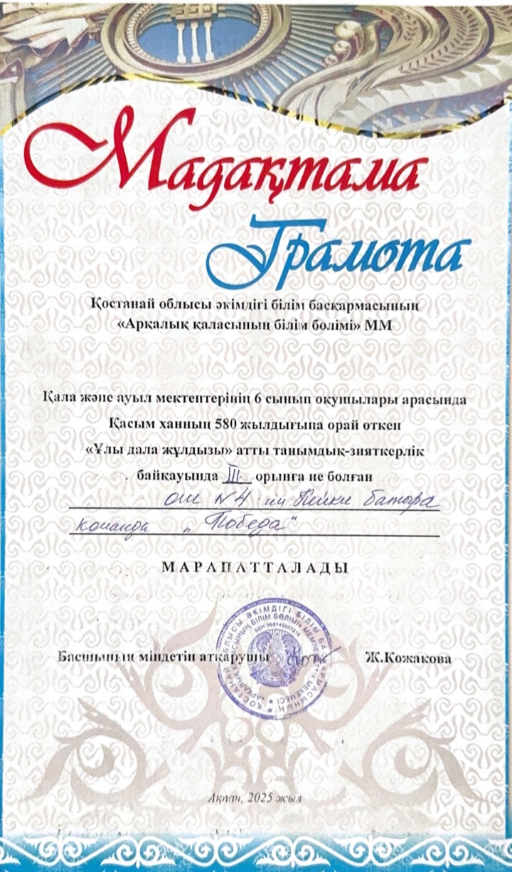 Қала және ауыл мектептерінің арасында Қасым ханның 580 жылдығына орай өткен "Ұлы дала жұлдызы" зияткерлік байқауында мектебіміздің 6 "В"сыныбы оқушылары жүлделі ІІІ орын иеленді. Жетекшісі: Бирмаканов К. С. құттықтаймыз!