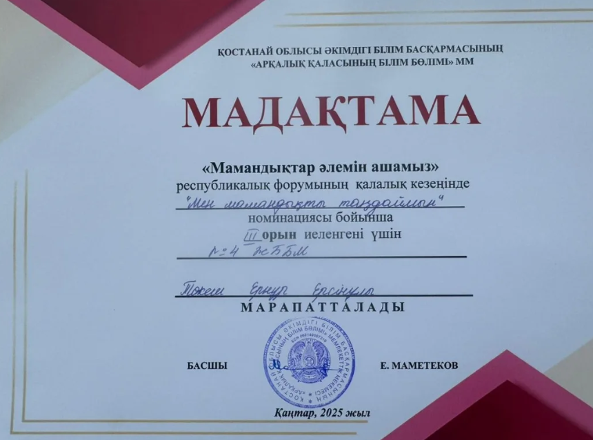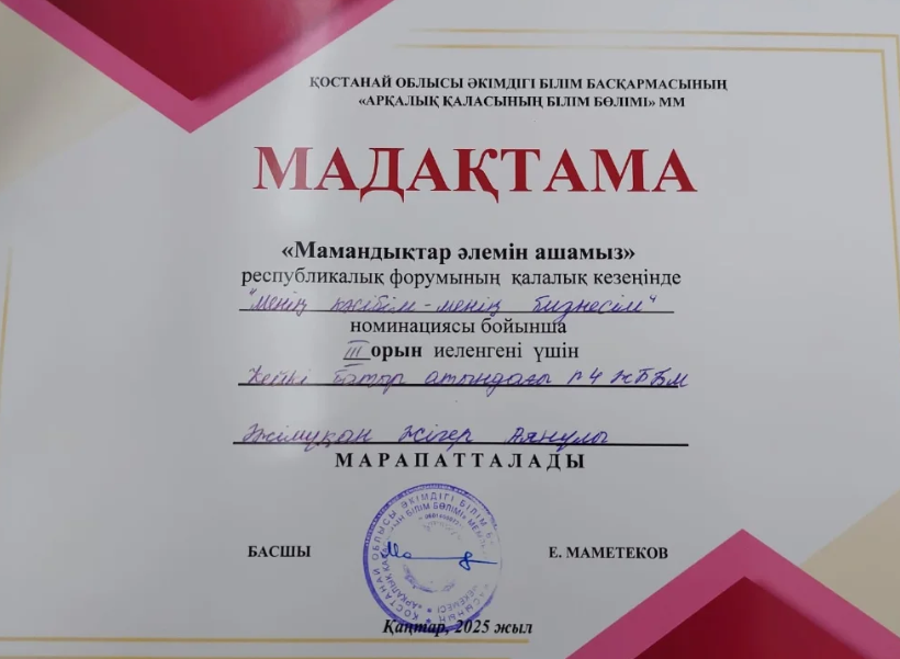 "Мамандықтар әлемін ашамыз" республикалық форумның қалалық кезеңінде "Мен мамандықты таңдаймын "номинациясы бойынша 9 "Г" сынып оқушысы Төкеш Ернұр 3 - орын. "Менің кәсібім - менің бизнесім" номинациясы бойынша 9 "Б" сынып оқушысы Әжмұқан Жігер 3 - орын. "Жас мобилограф" номинациясы бойынша 11 "Б" сынып оқушысы Серік Мәдина 2 - орын иеленді. Құттықтаймыз!