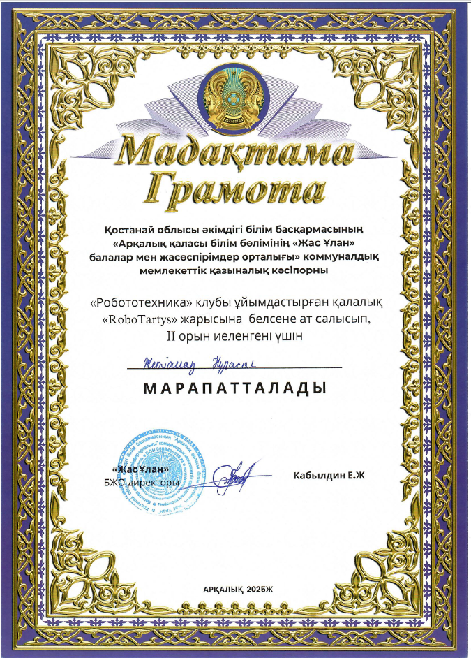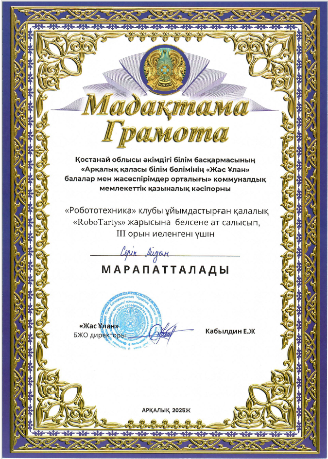 Қостанай облысы әкімдігі білім басқармасының «Арқалық қаласы білім бөлімінің «Жас Ұлан» балалар мен жасөспірімдер орталығы КММ «Робототехника» клубы ұйымдастырған қалалық «RoboTartys» жарысына мектебіміздің «Роботехника» клубының мүшелері қатысты.
