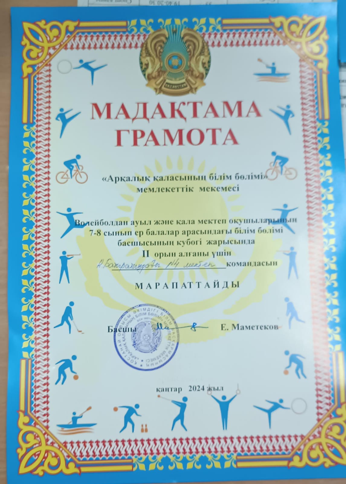 Лисаковск қаласында өткен облыстық шахмат лигасында мектебіміздің 5-6 сынып оқушылар командасы жүлделі екінші орынды иеленді. Жаттықтырушы Мүсілім А.А.
