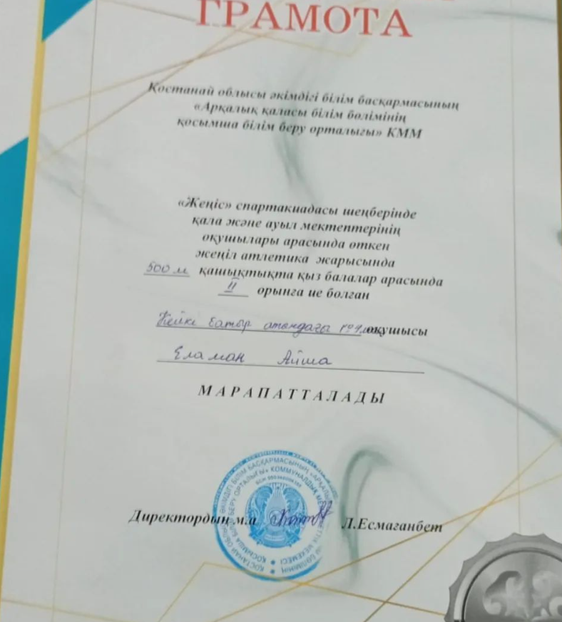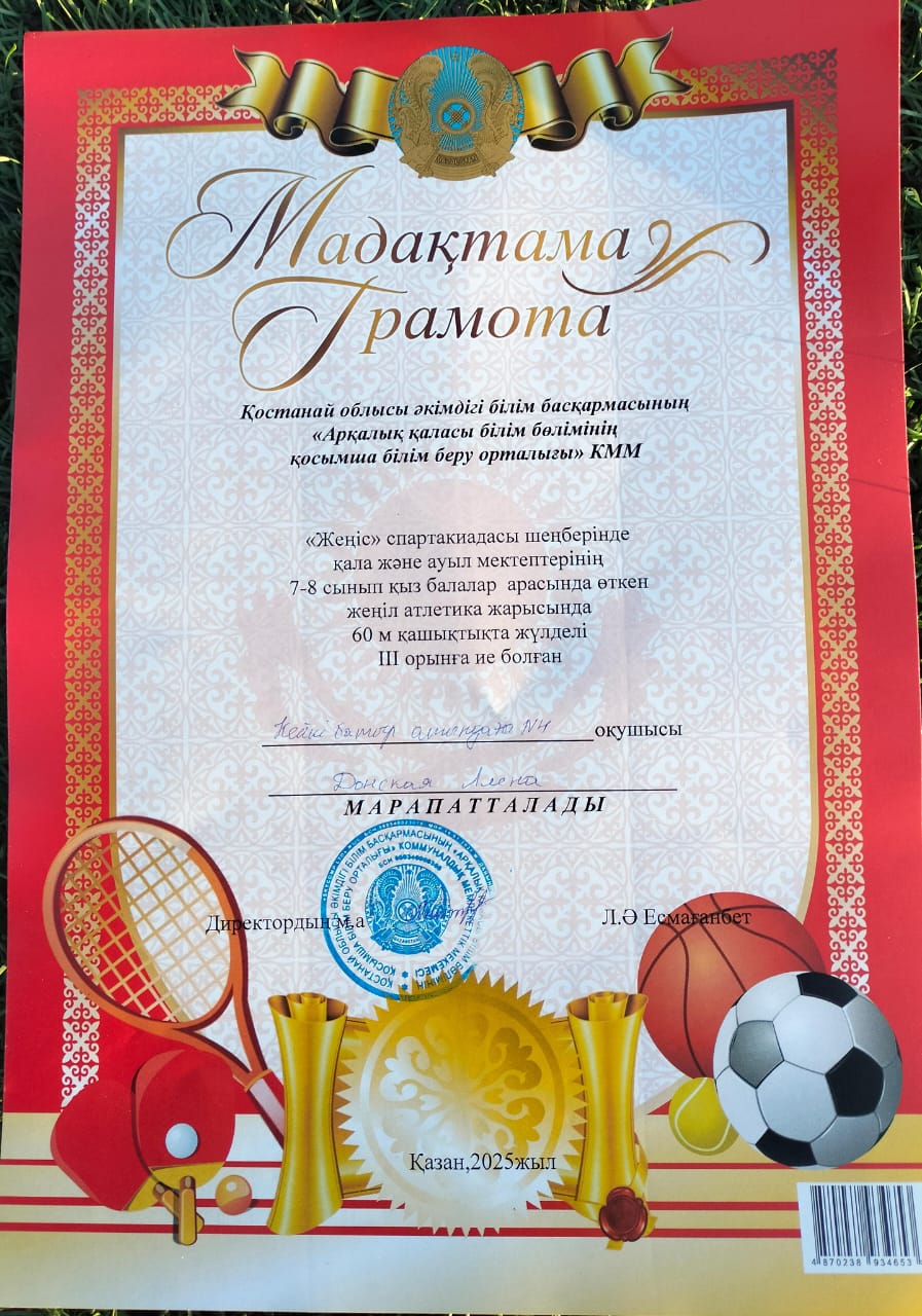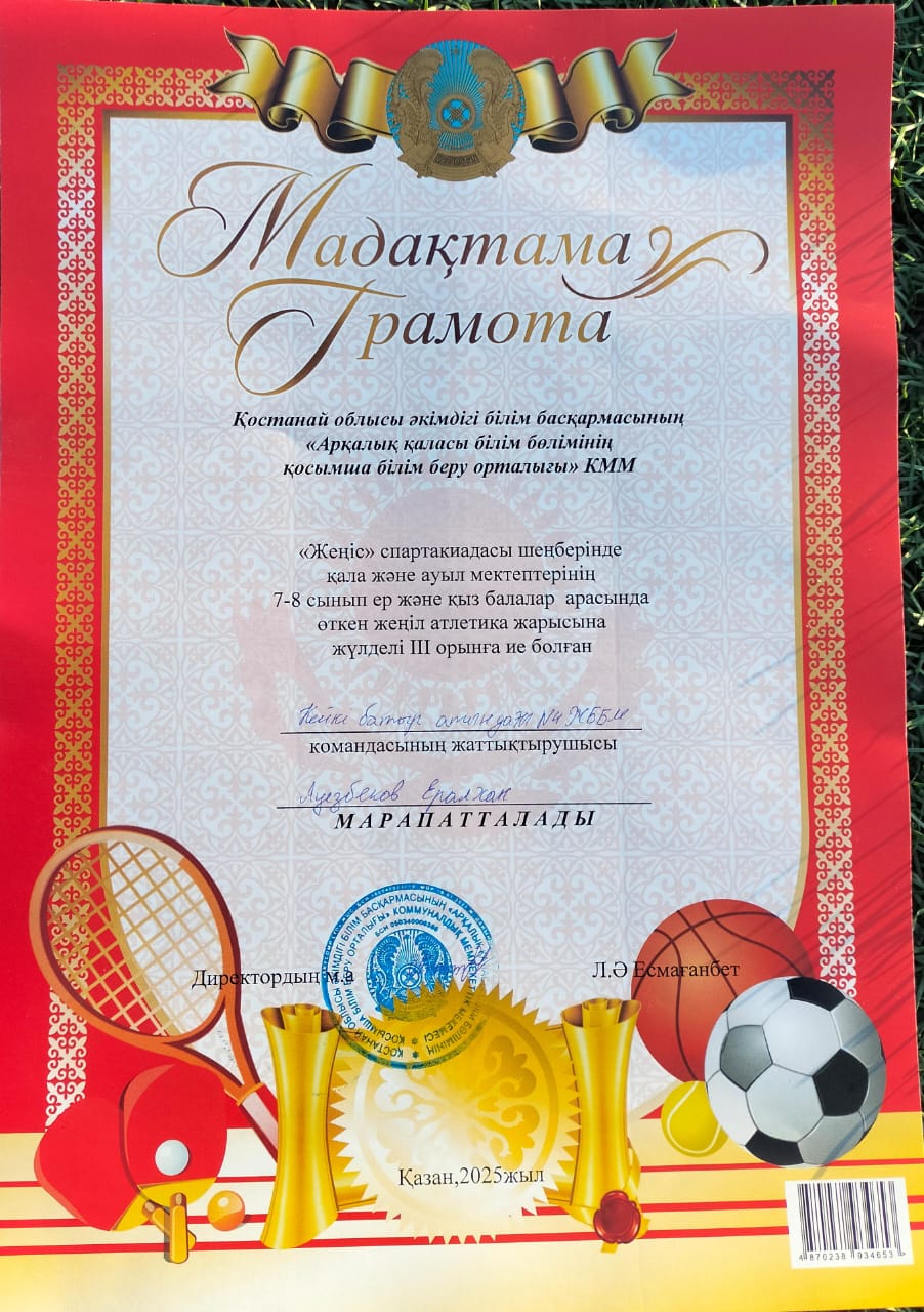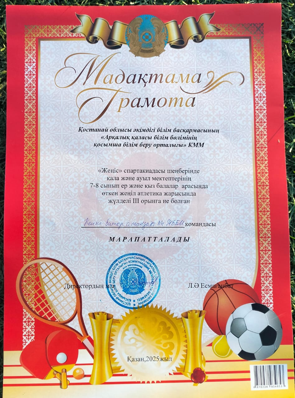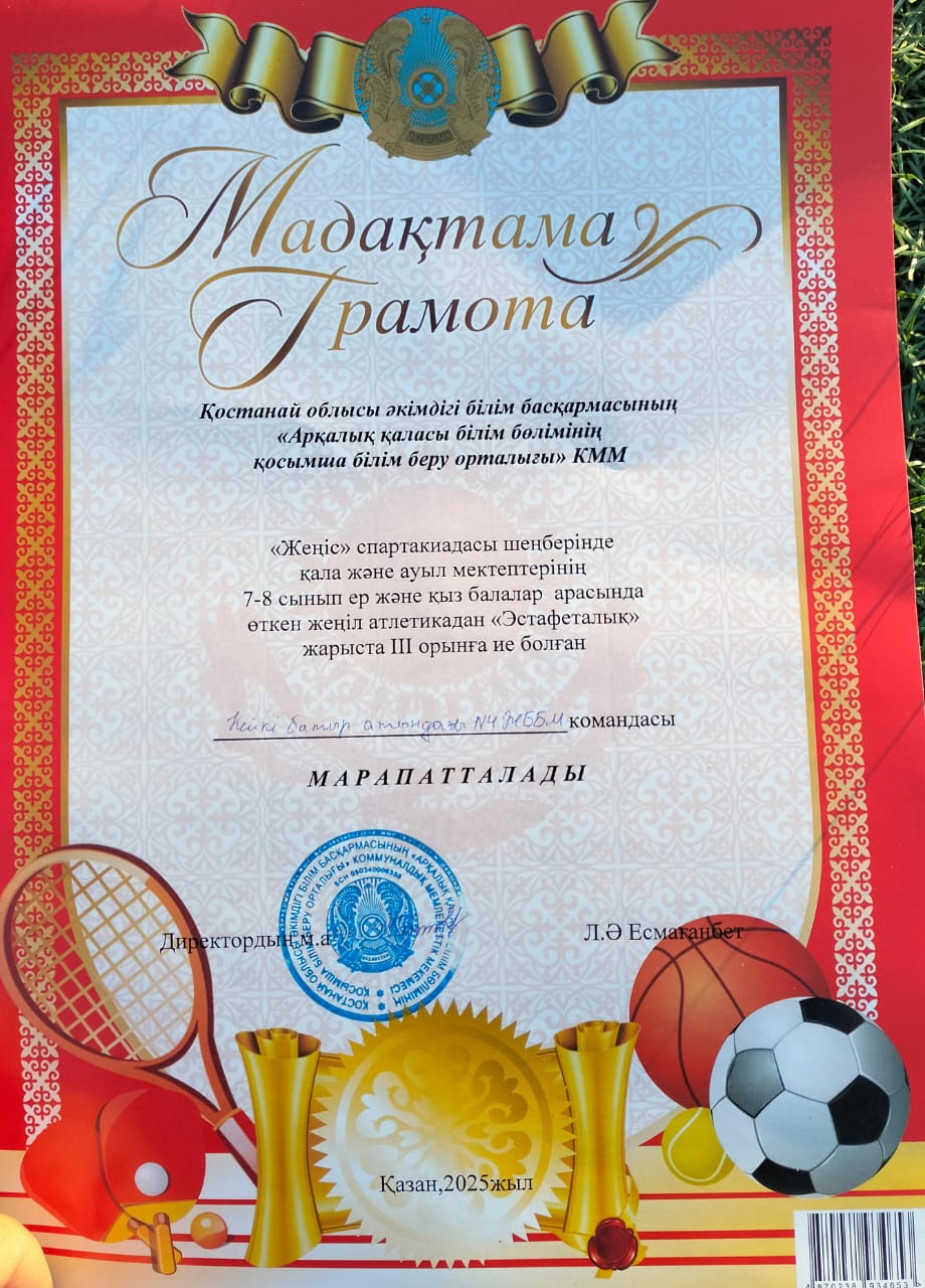 «Жеңіс спартакиадасы» шеңберінде қала және ауыл мектептерінің оқушылары арасында өткен жеңіл атлетика жарысы бойынша командалық есепте мектеп оқушылары 3-орын иеленді.