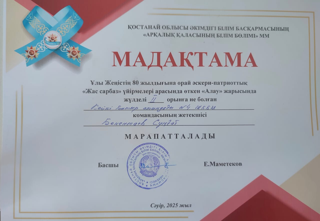 Ұлы Жеңістің 80 жылдығына орай әскери-патриоттық "Жас сарбаз" үйірмелері арасында өткен "Алау" жарысында мектебіміздің 8 сыныптардан құралған "Кейкі мерген" жас жауынгерлер бөлімшесі 2 орынға ие болды.