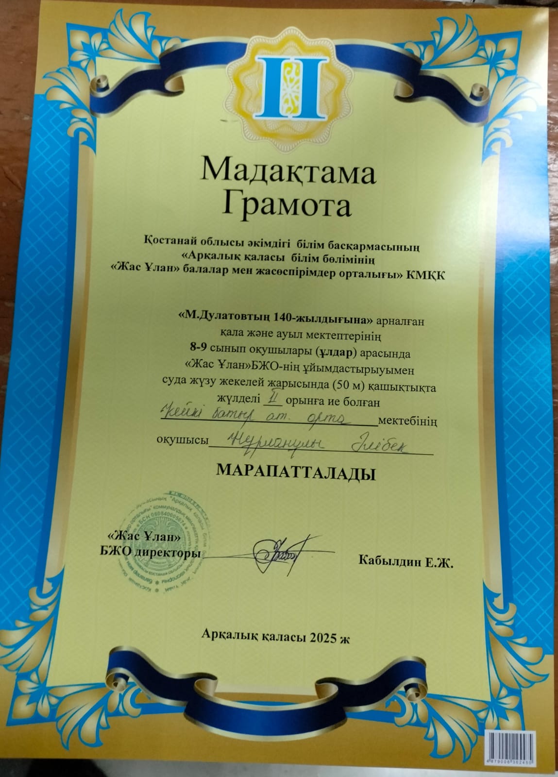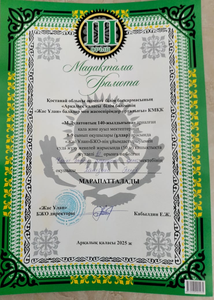 «М.Дулатовтың 140 - жылдығына» арналған қала және ауыл мектептерінің 8 - 9 сынып оқушылары (ұлдар) арасында «Жас Ұлан» БЖО - нің ұйымдастырумен суда жүзу жекелей жарысында (50 метр) қашықтықта жүлделі ІІ орынды мектебіміздің оқушысы Нұрланұлы Әлібек және ІІІ орынды Хамзин Әмір жеңіп алды.