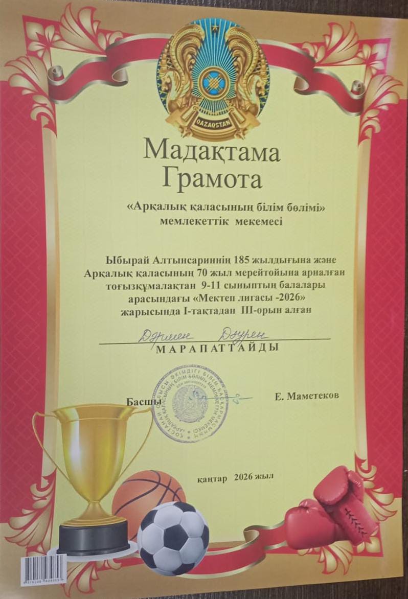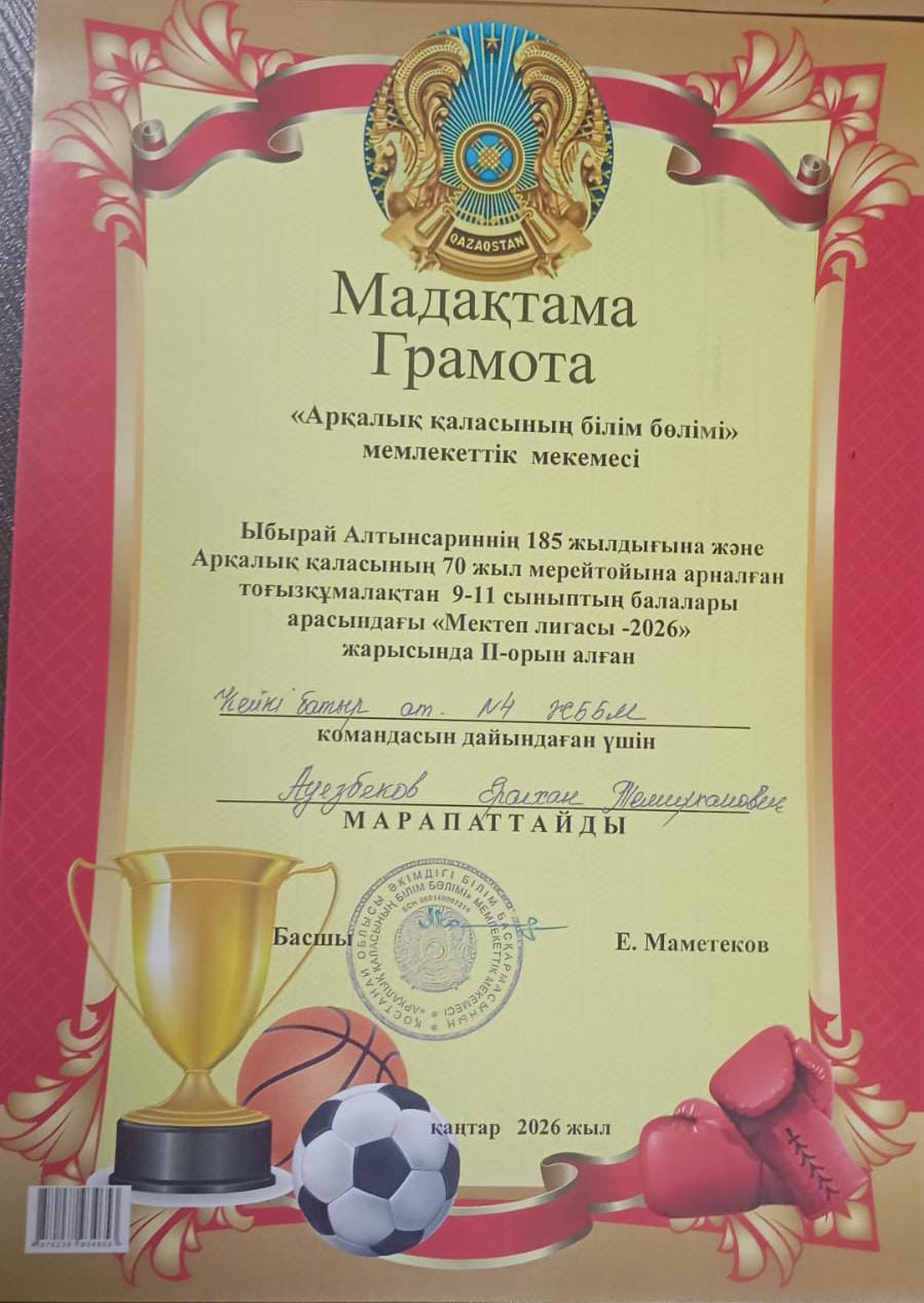 Ыбырай Алтынсариннің 185 жылдығына және Арқалық қаласының 70 жыл мерейтойына арналған тоғызқұмалақтан 9-11 сыныптың балалары арасындағы "Мектеп лигасы 2026" жарысында командалық есепте ІІ орынға Кейкі батыр атындағы №4 жалпы білім беретін мектебі жеңіп алды.